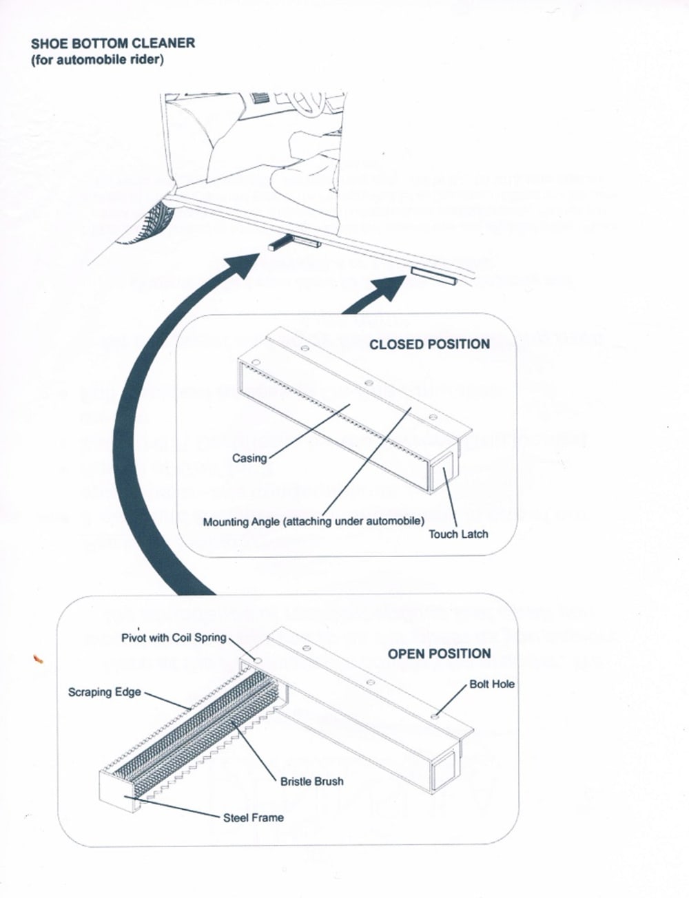 This simple shoe bottom cleanser can be mounted to the underside of an auto body to remove debris, snow, ice, mud, etc from the bottom of rider's shoe before entering the car thus keep the interior of one's car clean and sanitary. The rider unlock the unit with touch latch and the brush pops open before entering the car. The user needs to simply wipe his or her shoe soles against the surface of the brush. The cleaner is a long brush strip mounted onto an L shaped metal frame with one end pivot-ally attached to an L or U shaped metal housing unit as shown in the illustration. The device is firmly mounted to the underside and near car door location of an auto-body. The brush can be also motorized for quick and better cleaning.