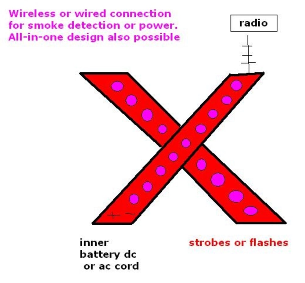 This remotely activated red colored LED "x" can be set off by a smoke detector that sends a wireless signal to this solar or lithium battery powered add-on to a child or youth's window.