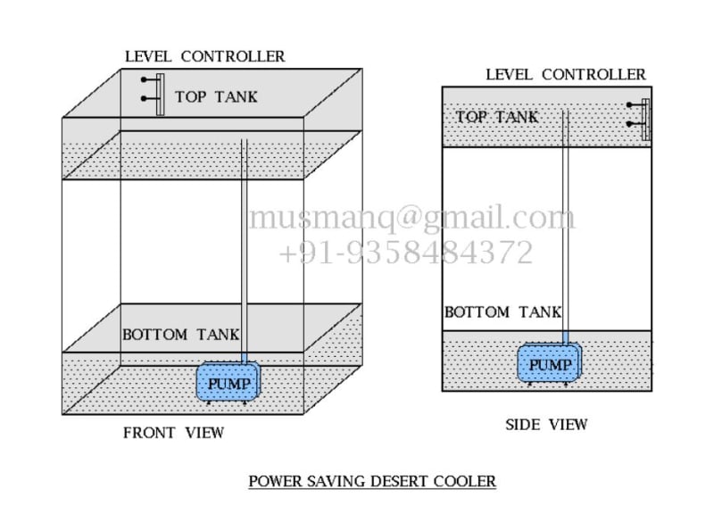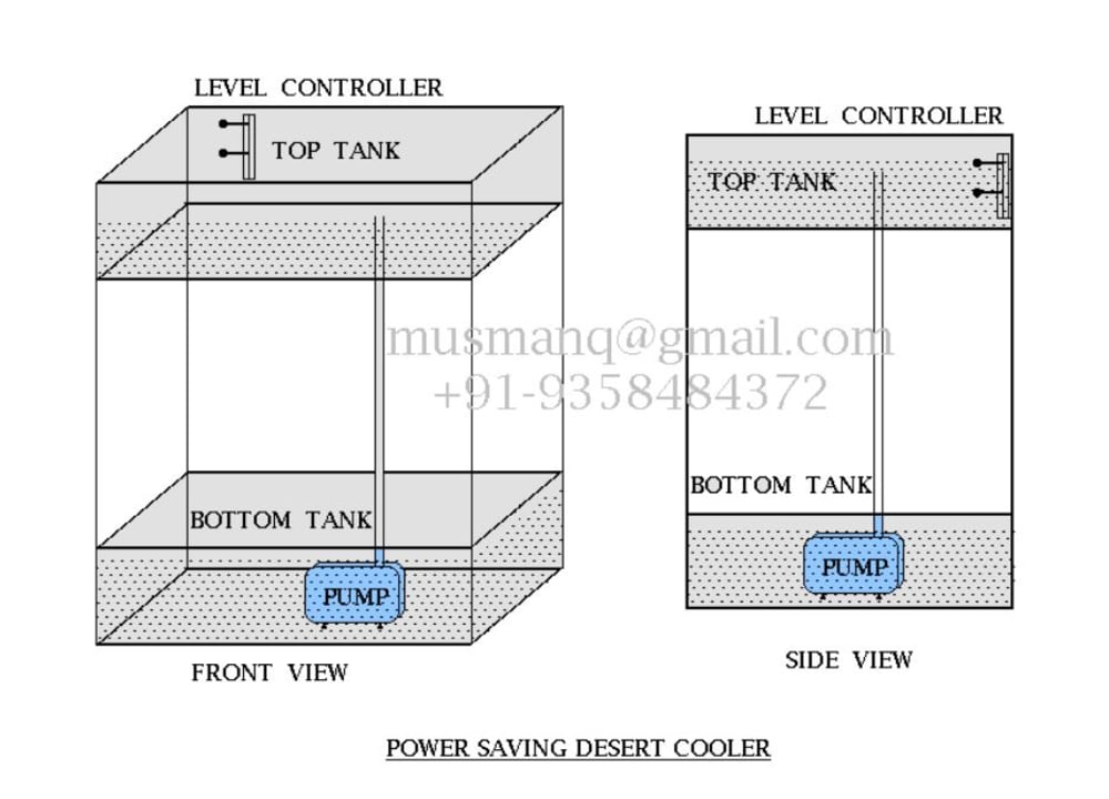 Water pump remains on to pump the water upward. This consumes power as the pump runs continuously. Power can be saved if on time of pump is reduced. This is done by adding an additional water tank at the top of the cooler body. Water, from existing bottom tank, is pumped to fill the top tank. Top tank supply water to wet the said three walls of the cooler. Hence, level of top tank reduces gradually and reaches minimum limit. Pump starts automatically when level of top tank reaches minimum limit. Pump gets off when level of top tank reaches maximum level limit. A level controller is used to control the pump. This arrangement saves precious electrical energy and extends the life of the pump.