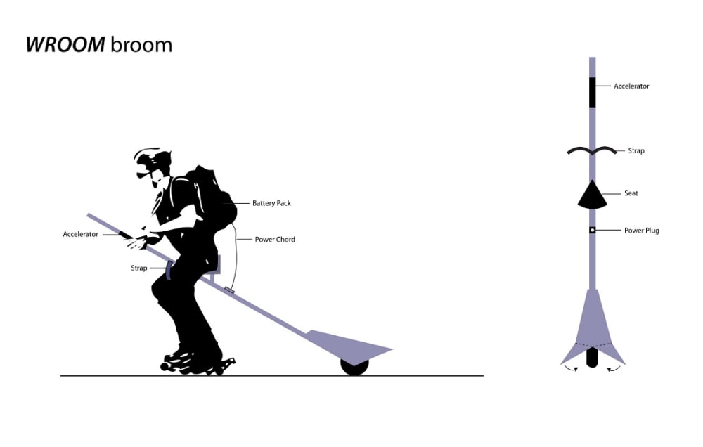 Using WROOM BROOM one would straddle the stick which would have a simple bicycle seat and a strap across the knees for support basically providing a solid 3 point support of the rider.