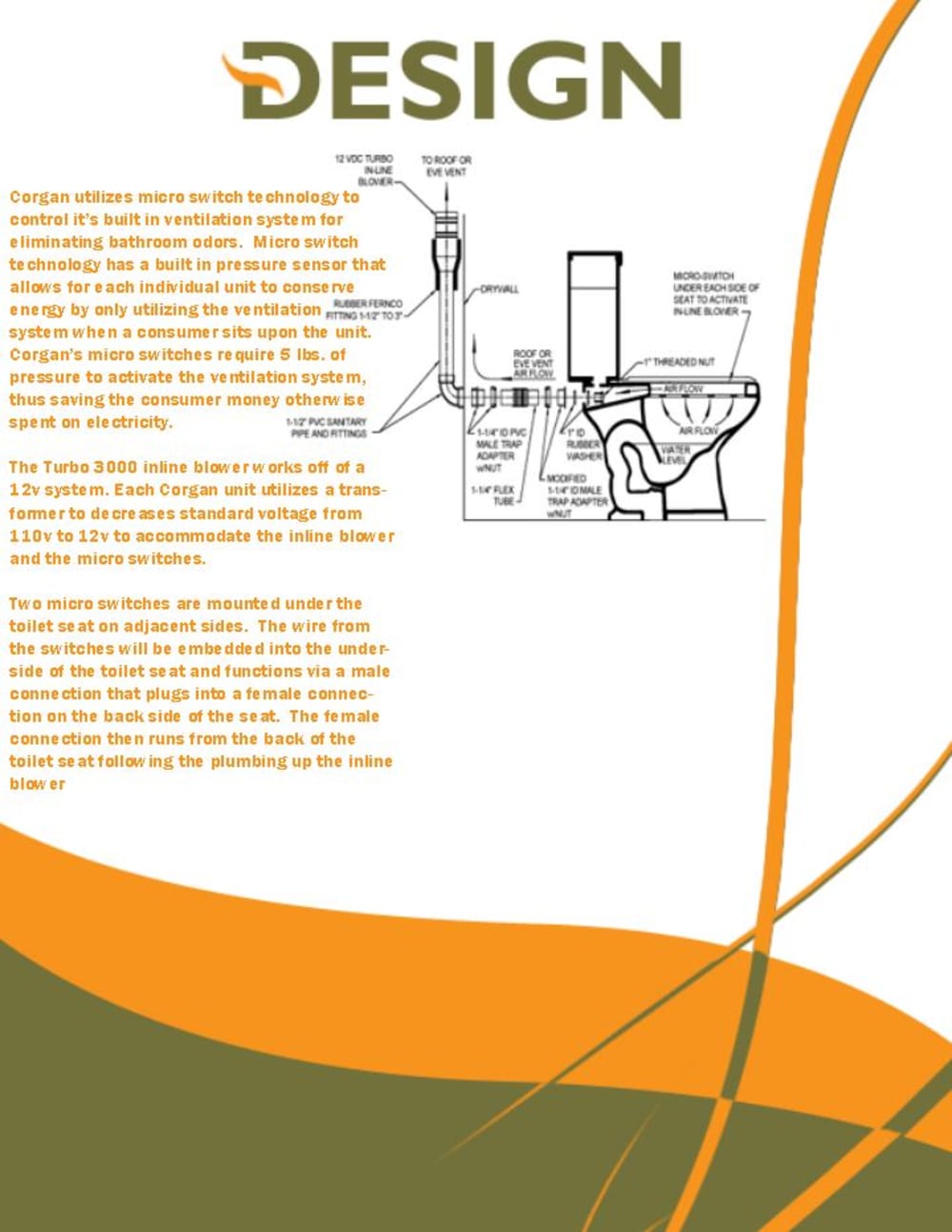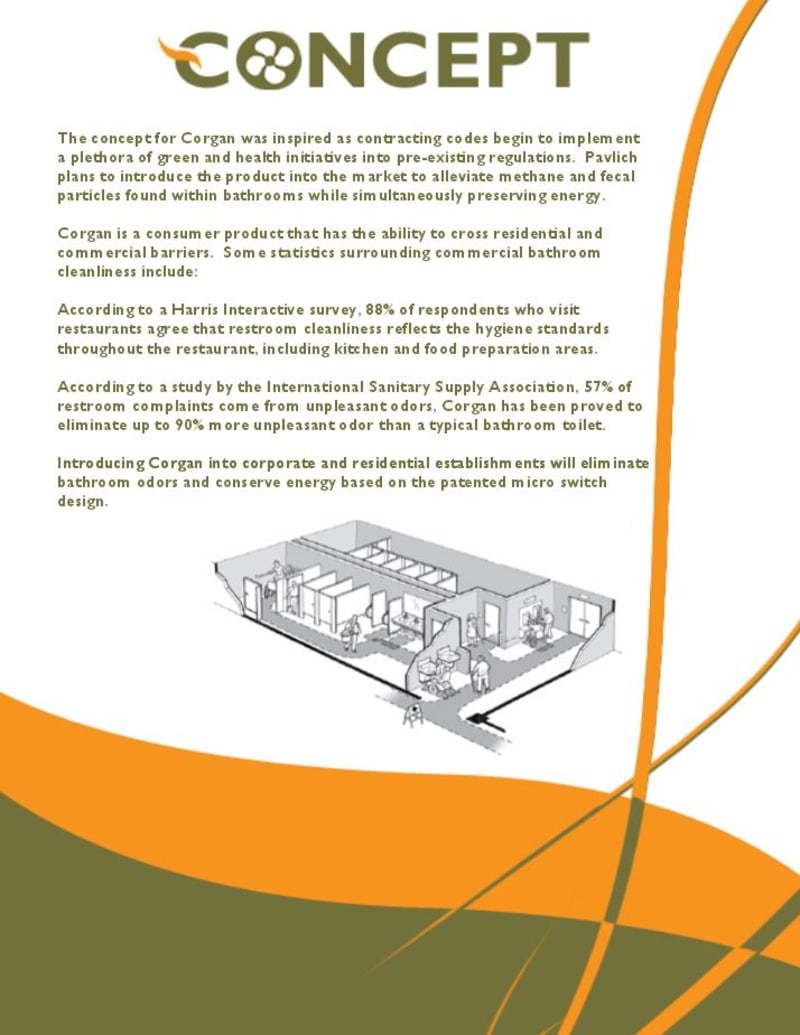 The Concept for Corgan was inspired as contracting codes begin to implement a plethora of green and health initiatives into per-existing regulations.Pavlich plans to introduce the product into the market to alleviate methane and fecal particles found within bathrooms while simultaneously preserving energy.