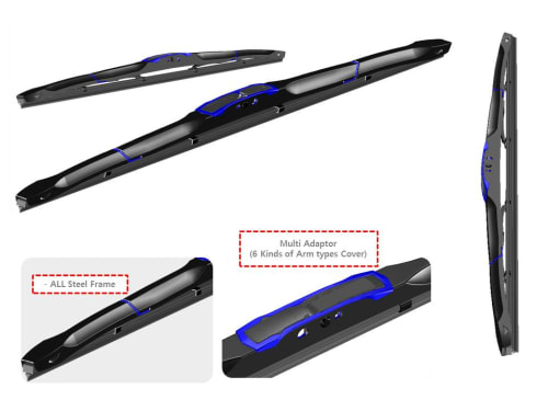 This is a full metal cover hybrid windshield wiper blade. It is a new design that is covered full world first. And, it consists of less parts. It is easy to manufacture. In addition, the even pressure distribution wave is shorter so, it gives you best initial wiping and best durability.