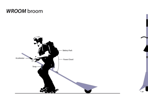 Many people use roller skates, skate boards or even ice skates. Traveling short distances with these devices is fun and good exercise. However, a simple device called WROOM BROOM would make longer distance travel with rolling foorwear a breeze.