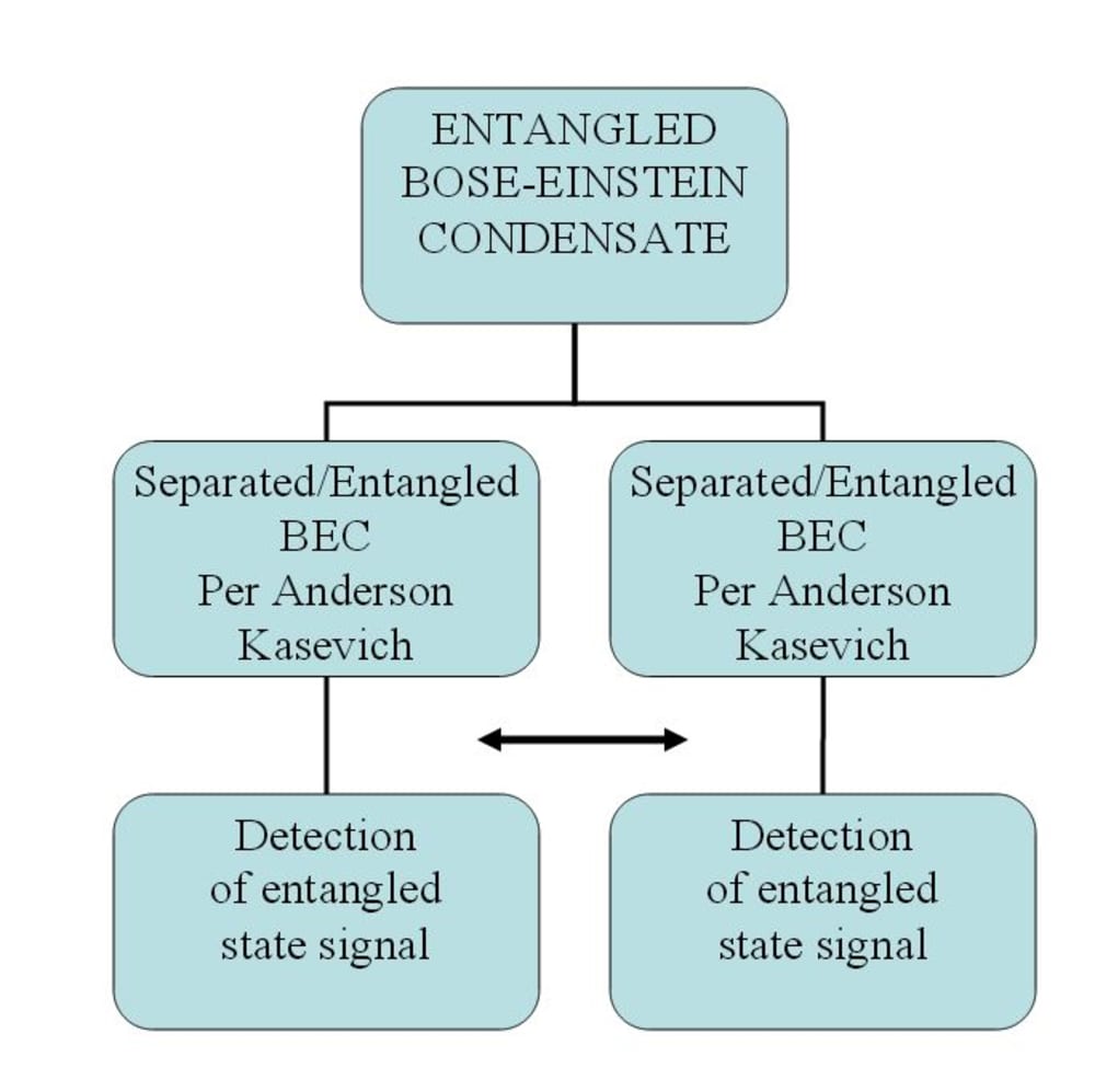 This suggests that quantum entanglement can be increased to 10 the 4th atoms. Then, from the 11/27/98 Science, Yale researchers Anderson and Kasevich show how to divide a BEC using an optical lattice. Once these BEC is divided, various methods can be used to detect the entanglement or and forced changes in the quantum aspect being observed across the divided BEC. Note this is not to observe quantum level interaction, but more macro level responses such as spin (George, et al, Oc, 22, 2012) or