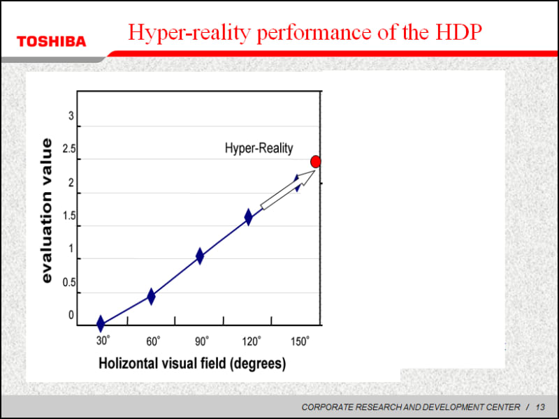 We invented a novel Monocular Hyper-Reality Display with wide 160 degrees viewing that consists of a dome-shaped wide viewing screen with a radius of 40 cm and 160 degrees, a mobile projector with ultra wide projection lens and LED light sources, as shown in Figure1. In this system, we observed the HDP with only one eye and wider viewing of 160 degrees, which reduced the visual distance sensitivity of the screen and improved the hyper-reality score by 1.5 point, compared to the binocular type display.
