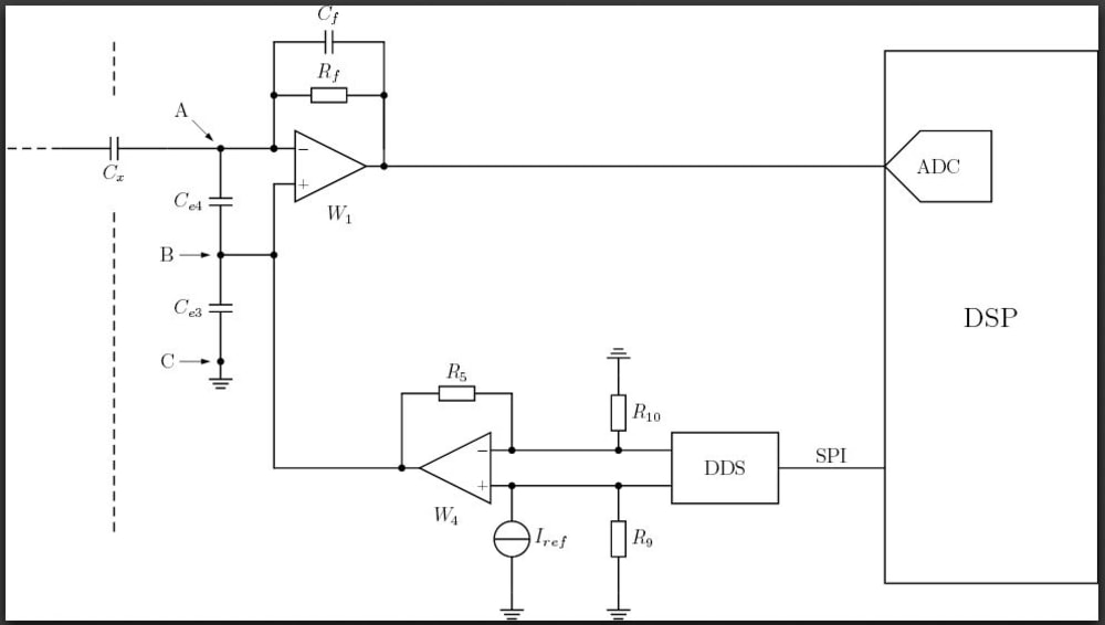 For this sort of applications the author prepared a new analog measurement circuit (see attached figure). It is based only on two amplifiers and direct AC-signal measurement (sine: ~550 kHz, sync. 16S/period, S&H). Every electrode placed around the tested object is connected (in point ‘A’) with its own circuit. All of them are working synchronically in the system.
