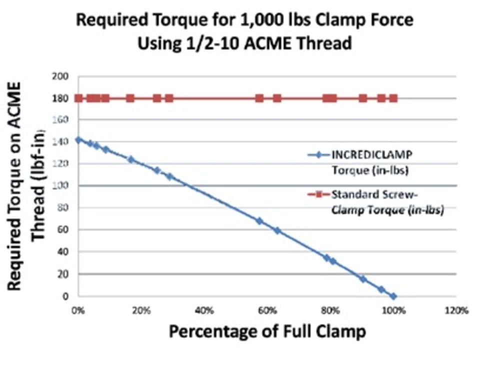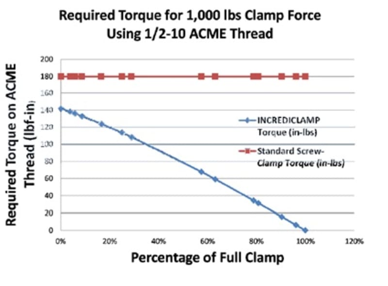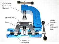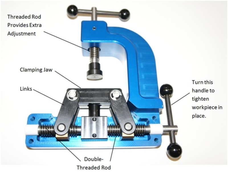 Such high clamp force is achieved by utilizing a dual-threaded screw to move the clamping jaw with a set of links. As the screw is turned, the angle of the links increases. This increases the mechanical advantage and clamping force. This means that the same amount of hand tightening torque will now result in up to 7 times the clamping force when compared to standard screw clamps. This results in less fatigue and a lower risk of injury.