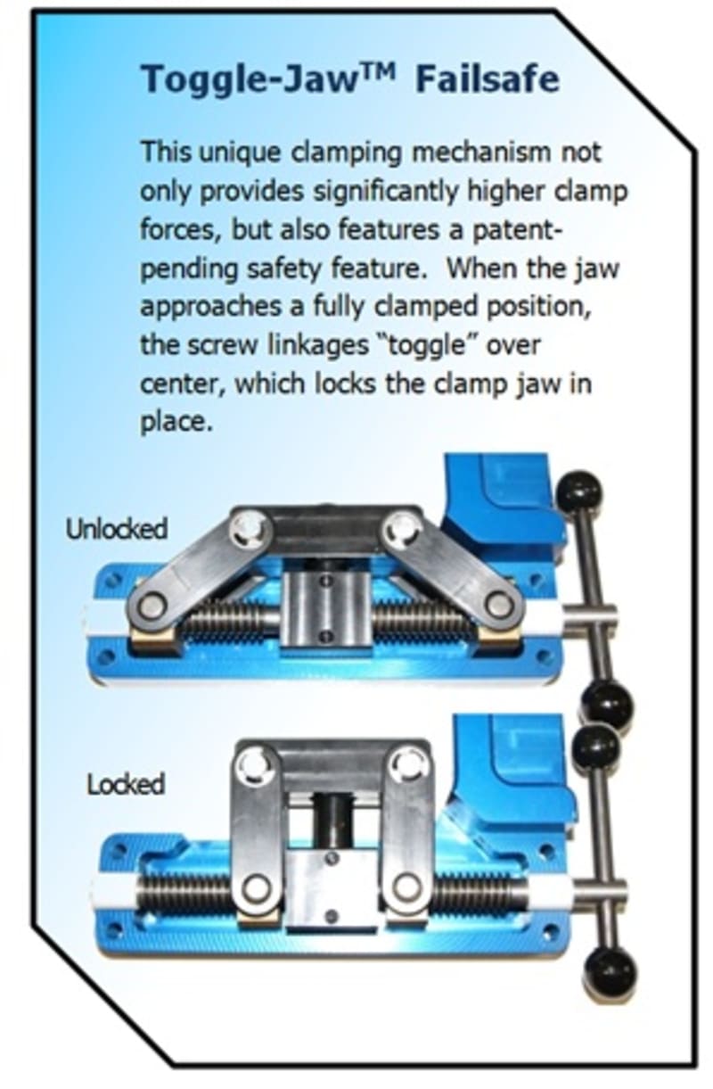 This unique clamping mechanism not only provides significantly higher clamp forces, but also features a patent-pending safety feature. When the jaw approaches a fully clamped position, the screw linkages “toggle” over center, which locks the clamp jaw in place. This clamp will not loosen unintentionally.