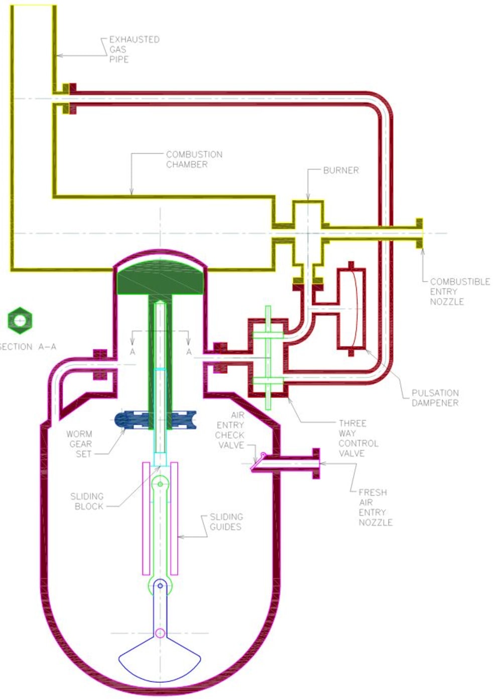 The engine shown in Figure 1 is an external combustion type engine which has two air ports, working in a way similar to a two stroke internal combustion engine.