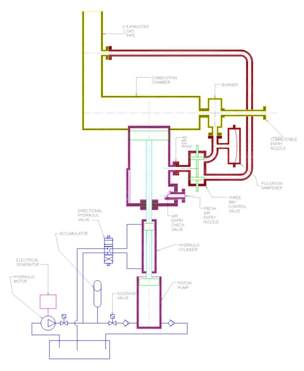Figure 2 shows an engine that works under the same principle of the previous one but now the crank shaft was replaced by an hydraulic pump and an hydraulic actuator.