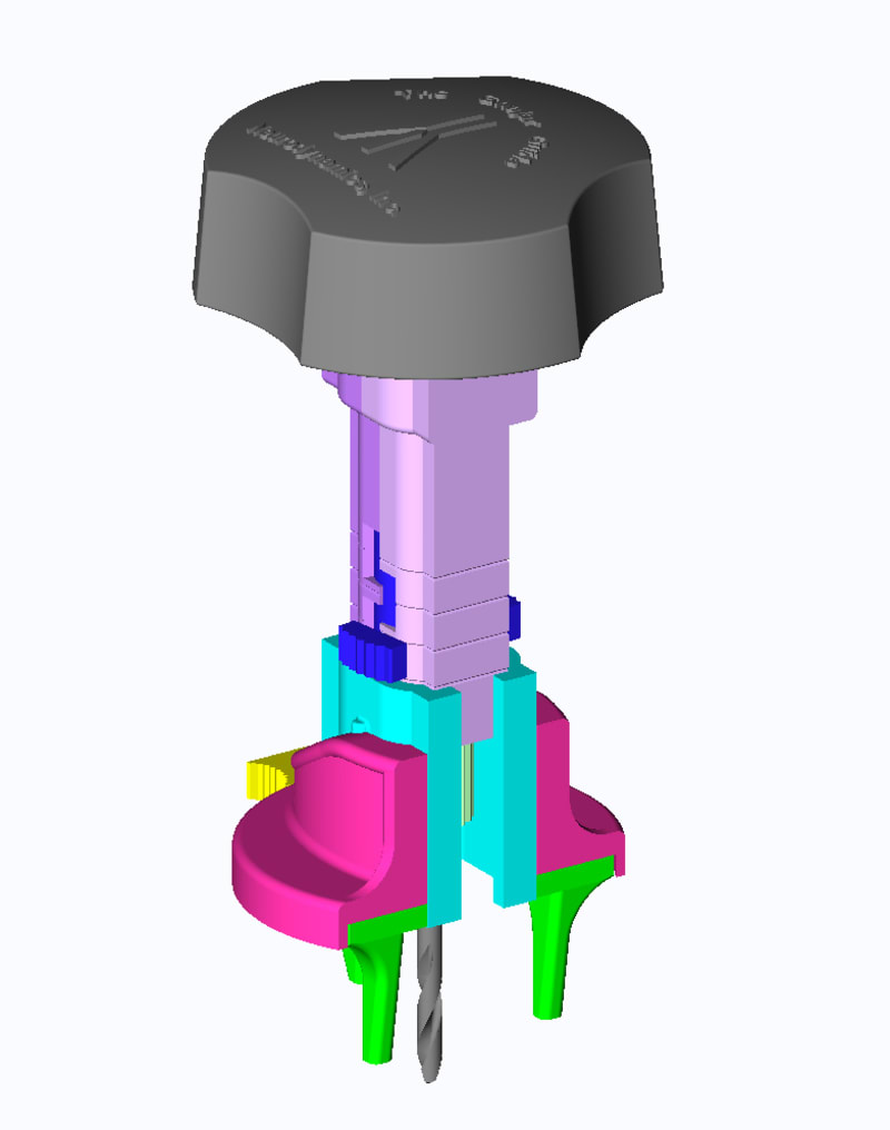 • A set of drill bits that are color coordinated for size. Each bit will have a specific plastic holder that will integrate with the drill assembly.