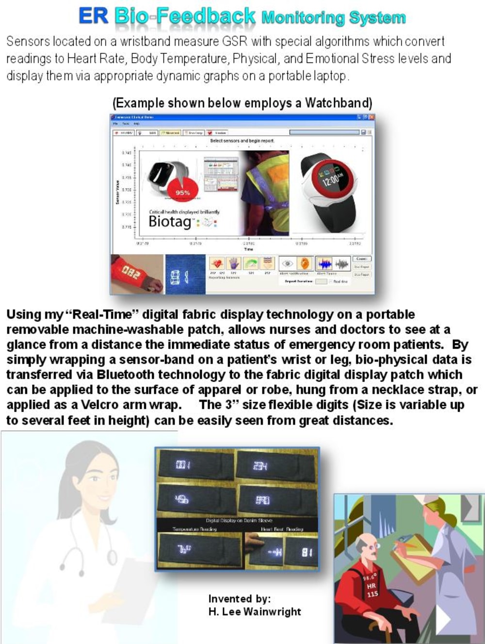 The output display measuring from a few inches up to 16” in fabric consists of multiple transmission and receptor points using LED/Optic technology coupled with Bluetooth and/or IR encrypted communication protocols. Receiving data from a small watch or bracelet with a GSR sensor measuring resistance changes in the skin, the ECG and heart rate measurements are converted through algorithms then displayed immediately at the surface of the fabric in full-color graphic representations and/or digital formats at an intensity automatically adjusted to ambient light levels. I demonstrated a prototype at the Smart Fabric Conference in Washington D.C. to a group of academia, engineers, and technology-based observers, applied for a patent, but haven’t commercialized it.