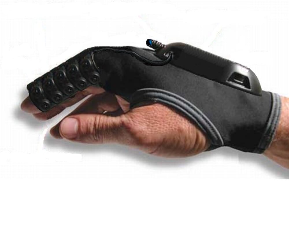 A laser distance meter captures the object distance in real time, the hand mounted processor and finger mounted pressure actuators translate this distance into a pressure applied in the finger.
