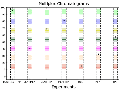 We present a novel method for the encoding and decoding of multiplexed biochemical assays. The method enables a theoretically unlimited number of independent targets to be detected and uniquely identified in any combination in the same sample. For example, the method offers easy access to 12-plex and larger PCR assays, as contrasted to the current 4-plex assays.