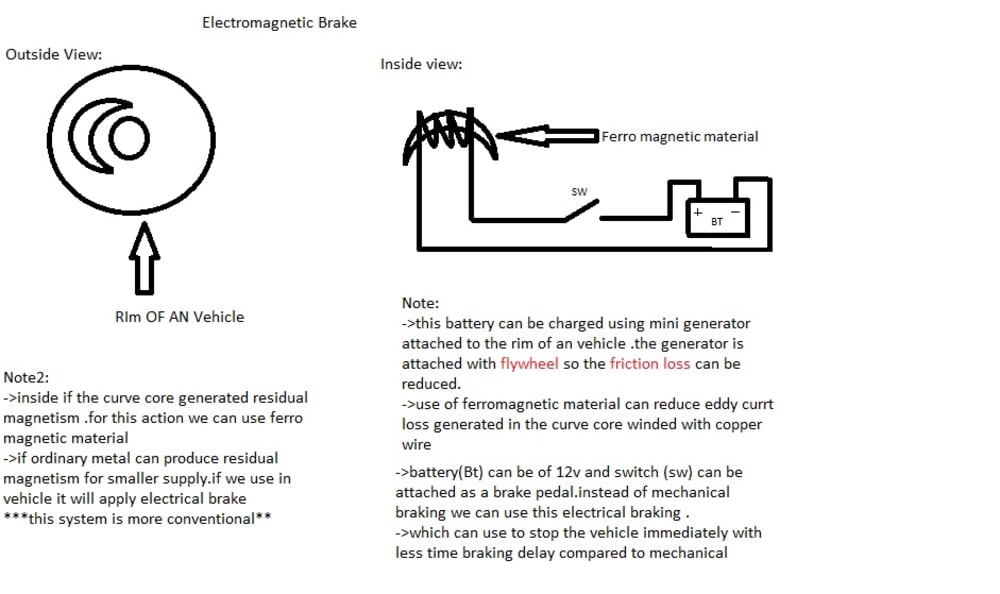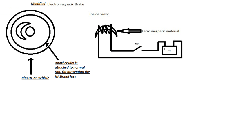 When the vehicle is in moment ,while we applied an brake(switch) ,the switch will be closed and makes the current to flow through the coil and the coil will generates artificial magnetic force ,this force will attract the rim of an vehicle to stop it. we modified an electromagnetic brake, a new rim is attached to the normal rim so preventing friction loss. in modified braking system we need to change the new rim after its gets damaged by friction, this is also an disadvantage but the cost of that new rim is about Rs:200 to 300 INR and $5 USD