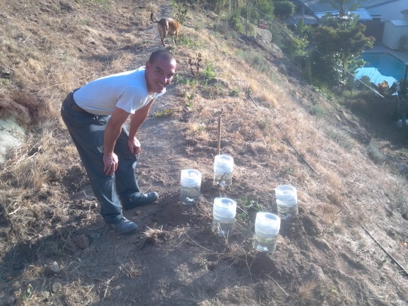 The new invention, self irrigation container ( SIC-A), in summary is a small colorless PVC container storing the rain water in closed reservoir and then feeding the plants gradually during the dry season to keep the plants alive and surviving. The dry period may be six months or more. We can control the feeding period by the container design and the relative chamber sizes. The SIC-A is more useful in the continental, tropic zone and deserts. Also practical in the slopes of mountains and hills.