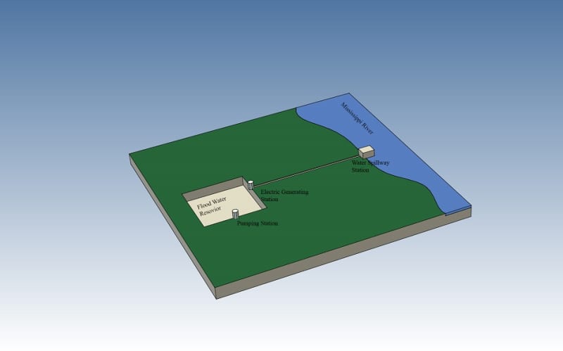 This system would comprise of several diversion facilities to store the flood waters. Each facility would include an open pit (4 to 5 miles square and 100 feet deep), an electrical generator (driven by the entering flood waters) and a system for emptying the pit. These facilities would be placed at strategic locations along the Mississippi river upstream of known flood prone areas. This would make a great government stimulus program with the following benefits: