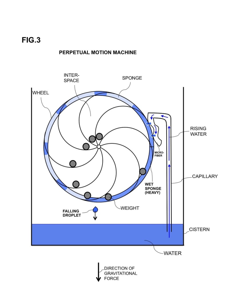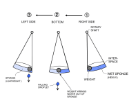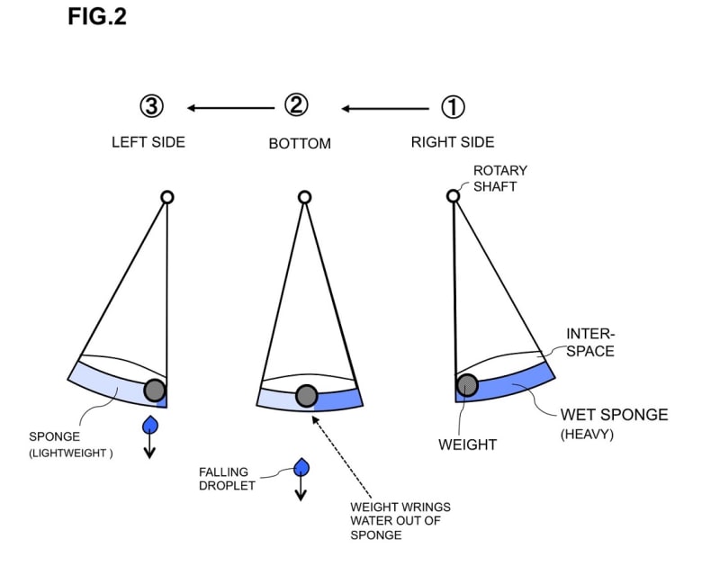 At bottom side of the Wheel, the roller-shaped Weight moves through the Sponge in accordance with rotation of the Wheel and wrings Water from the Sponge as shown in Figure 2. The Water falls into the Cistern from the Sponge. By squeezing the Water from the Sponge at the bottom side of the Wheel, water content of the left side of the Wheel is lower than water content of the right side of the Wheel at all times. So, unbalance between the left side and the right side of the wheels is maintained, and the Wheel continues to rotate.