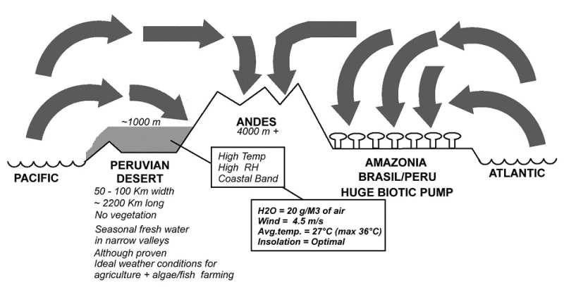 We have been working in the design of water harvesters from air humidity for the Peruvian desert, based in our knowledge and practice, but there was lacking a general theory behind our task, until the "Biotic Pump" concept of Victor Gorshkov and Anastassia Makarieva of the St. Petersburg Nuclear Physics Unit became known, then our speculations and findings made sense and gave us a lot of confidence.