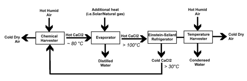 The energy that can be harvested has not a big temperature difference i.e. a 25°C collecting solution with a concentration of say 45% CaCl2 will end, in practical terms, with a 60°C to 90°C temperature. That is not a wide range for technologies like Bismuth Teluride termoelectrics, Rankine Cycle generators or Stirling motor designs. Although there is a theoretical hope in Cuprous Chloride termoelectrics that can work in that range of temperatures.