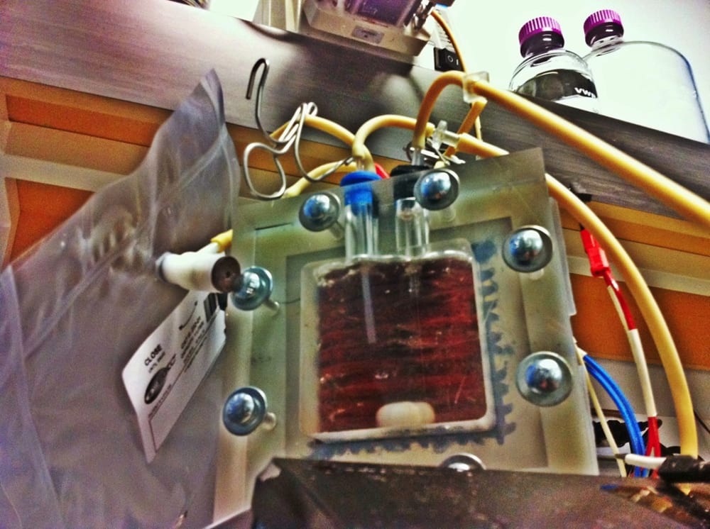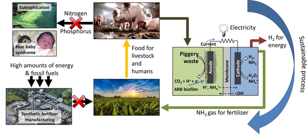 We believe that MFCs offer two major advantages over existing technologies to treat pig waste. First, anaerobic digestion – the current standard for waste treatment – converts pig waste to the greenhouse gas methane, which is combusted at low efficiencies (33%). Our lab has used MFCs to generate either valuable electrical energy or other chemical products (e.g., caustic soda, H2). Second, the effluent from anaerobic digestion requires additional treatment (nitrification/denitrification processes) to remove nutrients that are often not recoverable. With MFCs, the anode chamber strips organic carbons and nutrients, making it more appropriate for discharge into waterways. NH3 naturally evolved from the cathode can be easily converted to fertilizers. Using MFCs, we are creating a nutrient cycle through NH4+ recovery, which can lower the demand for synthetic fertilizers using fossil fuels. Thus, our application of MFCs represent a win-win scenario in which ARB benefits from growth and the society benefits from electrical energy, wastewater treatment, and nutrient recovery.