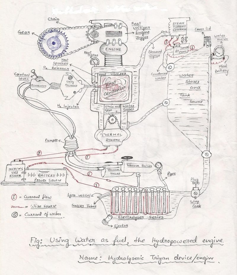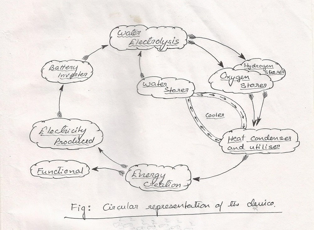 The idea of my design works on just simple laws of physics. A water tank will act as the water storage. From there, the water will pass to a vessel where electrolysis of the water shall be done with the help of a chargeable battery. The electrolysis process will split the water molecule into Hydrogen and Oxygen, which are the chief fuels in our device. Now the Oxygen will be injected through a sparker and blown in a heat furnace. On the other hand, Hydrogen will be passed through the fire, which will multiply the temperature of the furnace, thus ejecting a huge amount of heat energy. That energy can be converted to functional energy.
