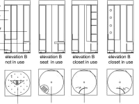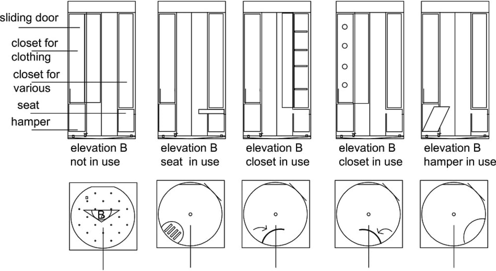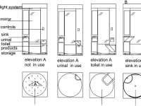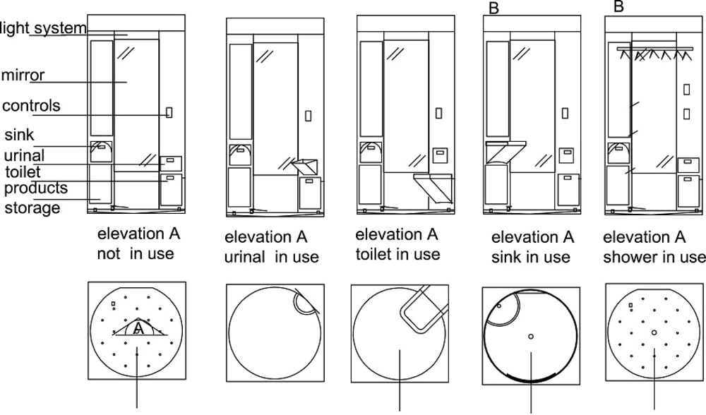 This system, based in a plastic cylinder inside a square area, allows in a minimum space, 1.20 by 1.20 m, height 2.40 to perform in total ergonomic protection, all functions related to personal care. While the user will stay in the cylinder, totally plain and without dangerous edges or right corners and volumes, in the corners left between the cylinder and the square volume, all fixtures will be integrated by different groups and will pop out as needed. The four corners are for the following functions: