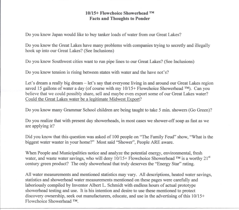 38,825 Mount Prospect residents ages 10 - 64 Saved 15 Gallons of Water Daily via my 10/15+ Flowchoice Showerhead™, 38,825 x 15 Gallons = 582,375 Gallons SAVED DAILY of Fresh, Chemically Treated, Purified, and Heated Water - Saved also was the 582,375 Gallons of Polluted Waste Water to Pump & Treat, in just One Village mind you... Since we've just SAVED 582,375 Gallons of Water from being used, and this Water is Moved (PUMPED) 4 Times before reaching our homes, then in reality we have also SAVED the ENERGY Cost of moving 2,329,500 Gallons!