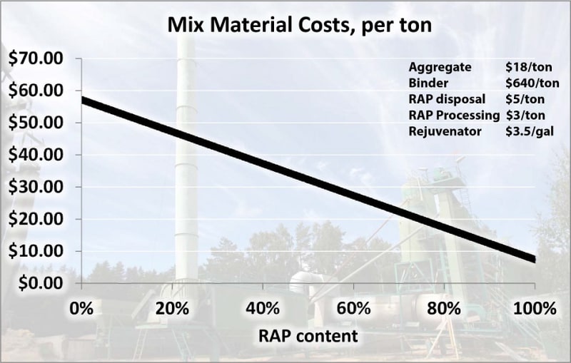 70% of the costs in a given asphalt mixture are associated with materials. Therefore, the use of the very inexpensive (or free) reclaimed asphalt plus rejuvenators would reduce the mix materials cost from around $50 per ton for conventionally used asphalt to less than $10 per ton with the use of 100% reclaimed asphalt (see figure). This dramatic cost reduction would result in more than $800,000 savings for a typical 10 mile long road lane, or considering the entire US asphalt production this would save 13.2 billion dollars annually. The only additional expanses for such production would be the introduction of filtration systems in the existing asphalt plants to capture the off-gassing from heating the reclaimed asphalt.