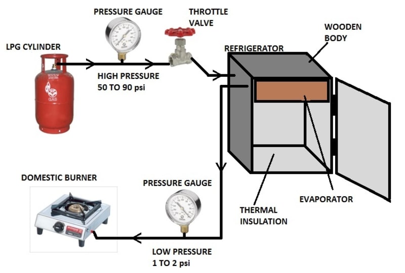 • The LPG leaves the evaporator in gaseous form; it is then directed towards the burner, engine, or any other application where it is to be used. Thus, no LPG is consumed for cooling purpose.