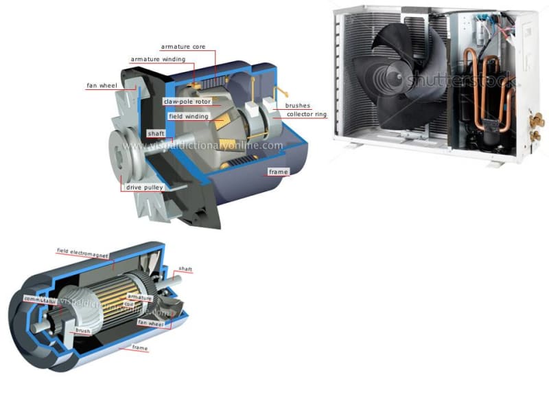 a) An electric fan motor revolving at a very high speed, almost 10,000 RPM, attached to 2 fan shafts, one at the front of the AC grille and one at the tail end of the AC.