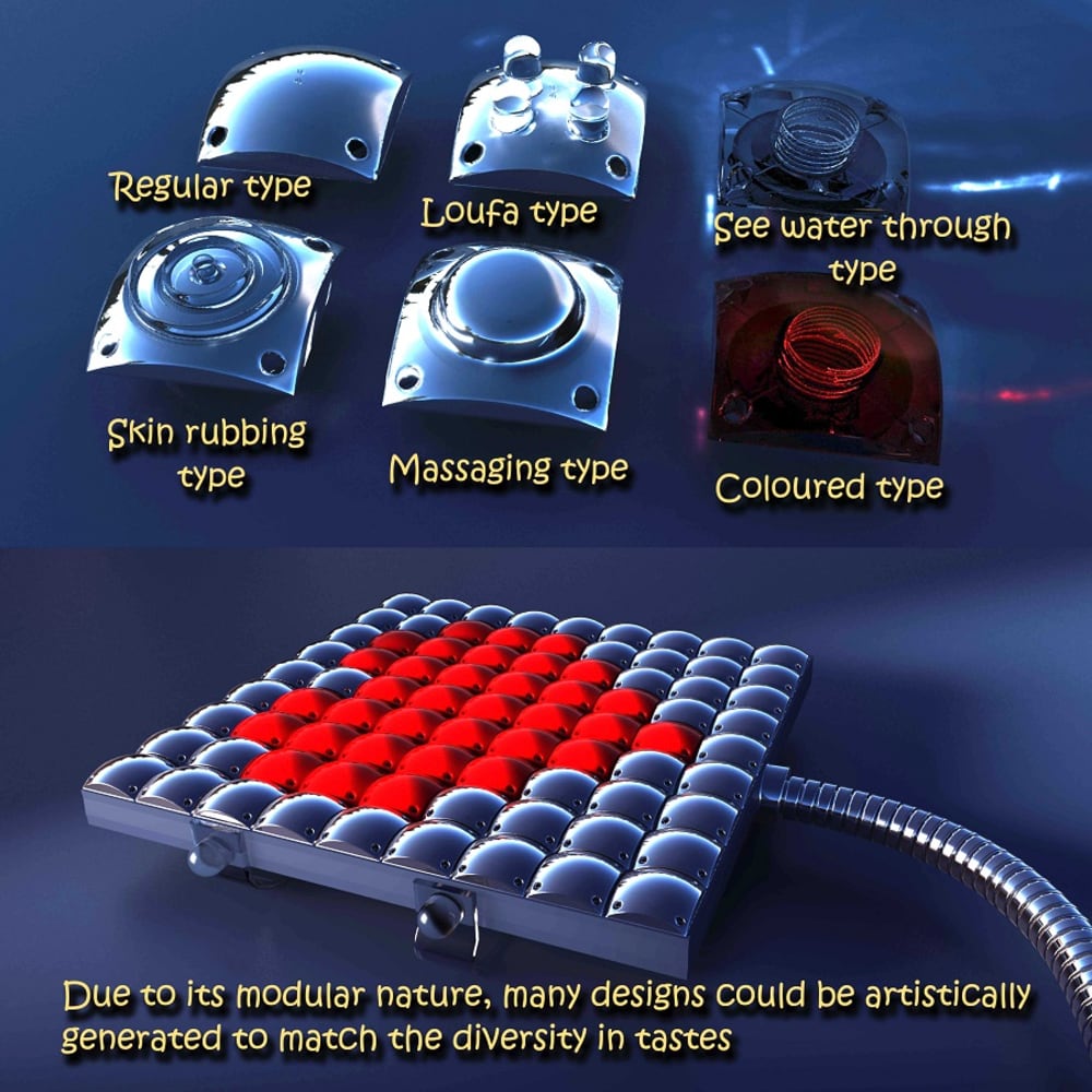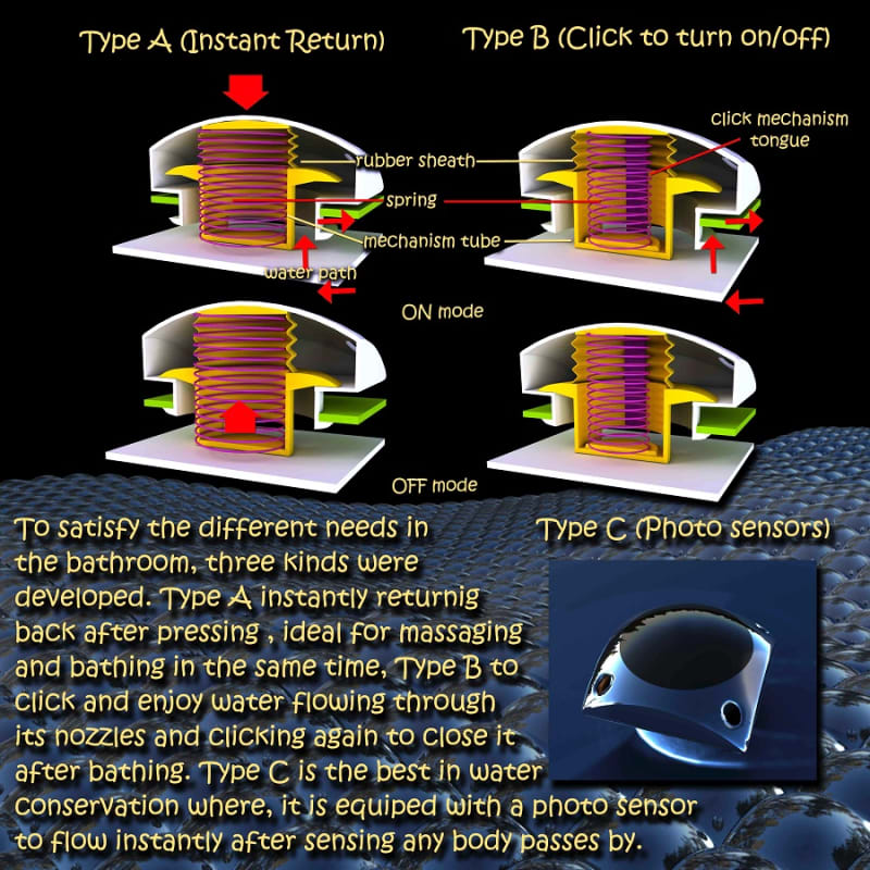 Due to its modular nature, many designs could be artistically generated to match the diversity in tastes. To satisfy the different needs in the bathroom, three kinds were developed. Type A instantly returning back after pressing, ideal for massaging and bathing in the same time, Type B to click and enjoy water flowing through its nozzles and clicking again to close it after bathing. Type C is the best in water conservation where, it is equipped with a photo sensor to flow instantly after sensing anybody passing by.
