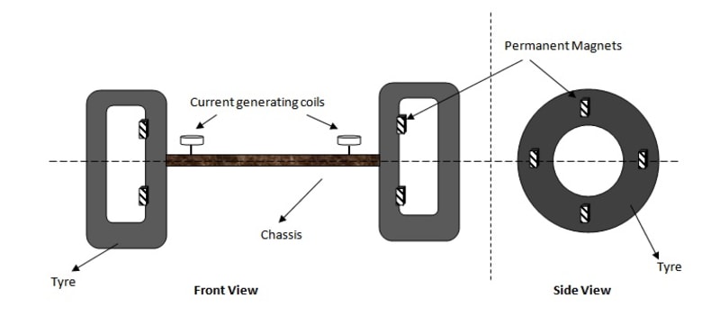 However, a magnet kept inside the tire cannot generate a very strong field due to isolation by rubber and eventually a very feeble current is generated at the coil mounted on axle or chassis. But the advantage is the very high rotation per minute and having four such combinations on each wheel.