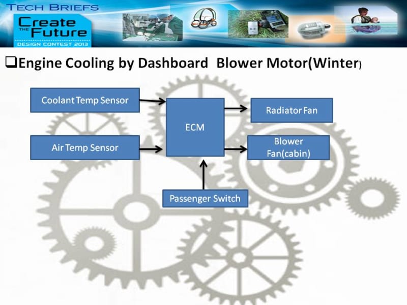 When the temp of air will go to -2 to 10 degree Celsius & engine got heated at that time then we will have the option to switch on the Blower Motor controlled by an engine temperature sensor through relay, by switching off the main radiator fan. In this system the Blower Motor will start to run before 80 degree Celsius to maintain engine temp at a constant level .