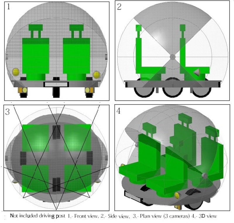 Car body has a truncated spherical shape, 1.6 m diameter, divided in four 90º pieces. The top and bottom (dark grey) are metallic with a circular reinforced tube and fixed to the floor. The floor is a box with reinforced tubes protecting against crashes in all directions. The front and rear pieces (light grey) are sliding transparent doors. The four wheels are in rhombic position allowing an easy driving.