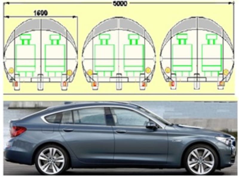 Front a rear sliding doors allows parking normal to the pedestrian lane. Access is easier in particular to wheel chair users. Also saves parking space because three cars occupy - side by side - the place that a 5 m length car.