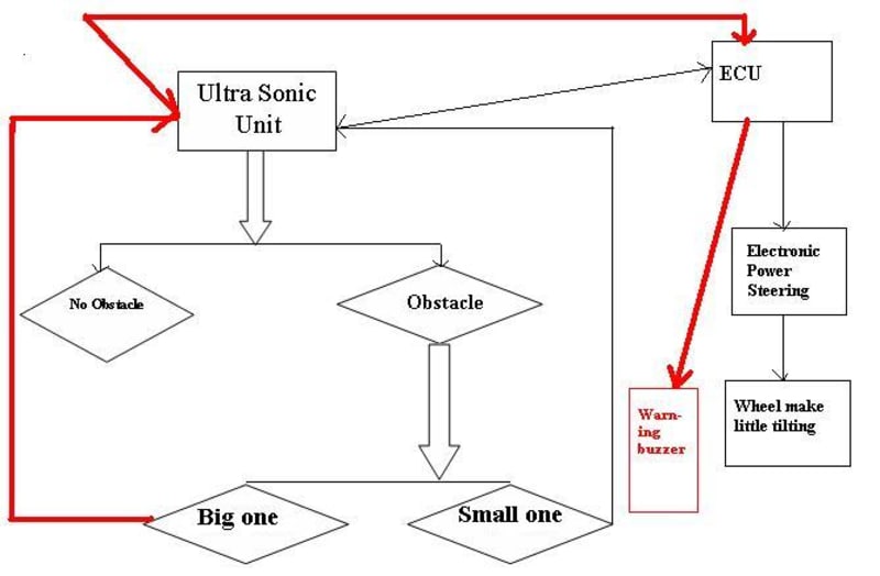 In fig 1 there's an ultrasonic unit built into the front tire bumper and if there's an obstacle in front of the car tire like big hump or small steel nuts the rays will return back to ultrasonic. If the obstacle is a small one which showed in black lines the ultrasonic unit gives signal to ECU which gives signal to electronic power steering to make steering oil to go from one side to the other side to make little push to the steering arm and tire tilting away from that small obstacle.