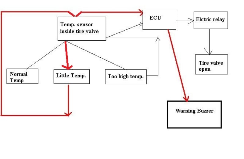 If the temp. sensor detect that there's a high temp. inside the tire and the pressure inside the tire increases so to preventing tire explosion there will be feedback signal to ECU to electric relay which push the needle of tire valve to be opened making the extra air to escape from the tire to the atmosphere all this showed in black lines.