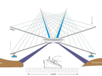 The fulcrum for the 2,400 foot crossing is an “A” frame, supported by 4 structures, two from each island, which also is the base of a large platform at about 1,200 feet in the air, leaving open the shipping channels underneath.