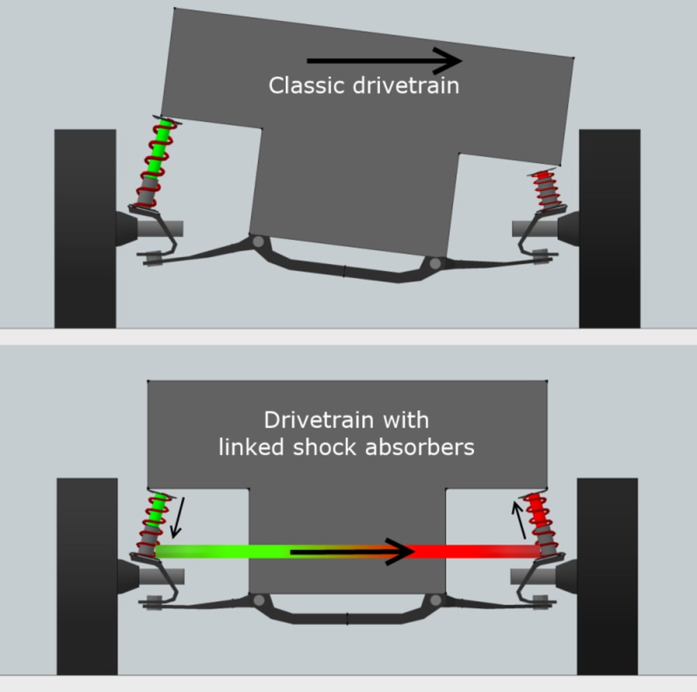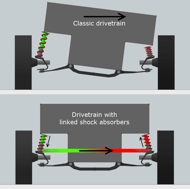 Car suspensions have changed little in the last 100 years: a spring coupled with a shock absorber, to compensate for sudden level variations. A major flaw of this system is the symmetry of suspensions during a turn. Because of inertia, the car tilts on the outside and shifts its weight on the outer suspension, and lowers adherence.