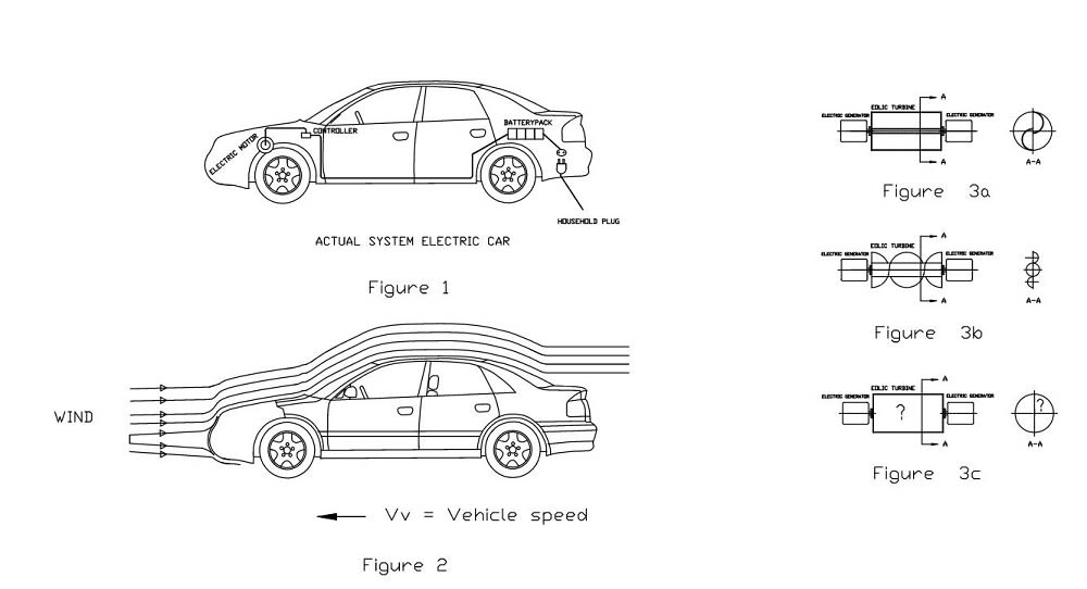 The design of EOLECTRIC CAR solved the disadvantages of the electric cars, with the wind that provide air resistance (fig 2) because this drag force can used to rotate a eolic turbine: type savonius (see fig 3a) , Helicoidal (see fig 3b) or it will need to design a very efficient new type of eolic turbine (see fig 3c), so the eolic turbine will have two electric generators in both sides (fig 3a,3b and 3c) in order to be continuously generating electricity and charging the batteries while the car is in motion.