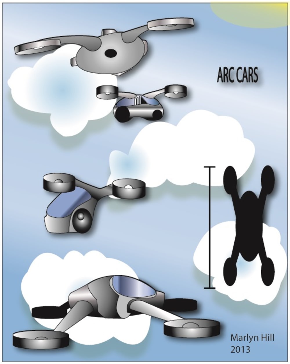 ARC is Antonymous Robot Computer or Controls. ARC System is comprised of a set of objectives. For simplicity here are some objectives. 1. To secure all a safe travel. 2. Human robot interaction controls ARC vehicles. 3. ARC assists driver by automate stabilizing the vehicle. 4. Guide and reroute using ARC Network. ARC Net is the Main system. The ARC Vehicle mainframe is connected to Google's Earth, GNSS, GPS, and the one of a kind software installed on each creation date. ARC Software prerecords and logs virtual flight coordinations. This is known as PRP (Prerecorded path), a source of collected data personalize by each ARC car. The network can track each vehicle. The PRP can be used by driver to set autopilot. Some ground cars will have the option to be connected to ARC network. At a later date there can be more vehicles on the ARC Net, but for now let’s focus on two types. The first of the ARC Cars is ARC Fly, a small security robot which can be used by hobbyist, home owner, fire fighters, and security guards. Second on the list is the marvelous ARC Quad, a personal flying robot. These vehicles will vary depending on how it is used. The aircraft is a modified quad copter with inverse ducted fan propellers. The wheels on these vehicles are virtually invisible. Each ARC can be switched remotely from manual to antonymous, as well as on and off. All vehicles will a have Callsign ID assigned and only those men and women with authorize access can request data aboard without diver Keycard.