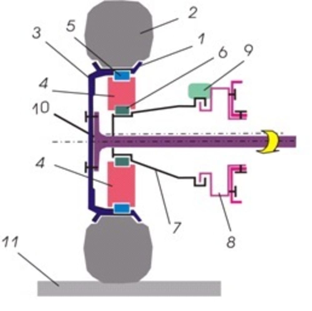 By means of next bearing 6 a hub 4 is mounted in a support center 7 of a frame 8. For design simplification the element 7 has possibility of turn concerning a frame 8 by means of the mechanism 9. For torque transfer the disk 3 is fixing with a axle 10. The wheel moves on a support surface 11.