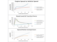 The performance curves of existing and improved designs are shown in illustration 3. The engine speed is reduced in total range of vehicle speed (Graph 1). This is due to higher overdrive achieved by differential gears such that, at 8 Kmph higher top vehicle speed, the engine runs at Maximum torque point where SFC is best. The Maximum tractive effort is increased by 15 % and at lower vehicle speed leading to increased acceleration of vehicle (0-60 Kmph is reached 1.2 sec early). In conventional CVT Vehicle top speed is limited by steeply dropping power curve beyond rated speed and tractive force balance with road load. With improved CVT, it is limited at balance of the Maximum tractive force at peak torque point and road load. This also indicates the potential engine down sizing possibility adding to reduction in overall cost, emission and fuel consumption. The third graph compares the vehicle speed and Kmph/1000 engine RPM. With improved CVT this factor is continuously increasing up to 19.6 till top speed as compared to 9.85 with conventional CVT indicates the reduction in engine speed achieved for higher vehicle top speed. This design is applicable to all the CVT driven scooters and bikes.
