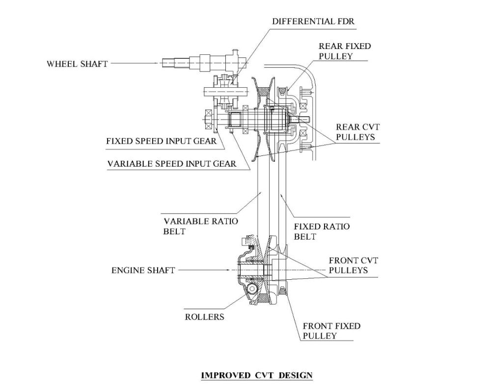 The modified design of CVT is shown in illustration 2. It mainly comprises Front & Rear Variator pulleys, Front and Rear fixed ratio pulleys, two concentric input shafts to FDR. The FDR with a differential mechanism receives the two Input speeds. Output Speed and Torque is as per the difference in two Input speeds. The difference in two Input speeds is adjusted by the variator pulleys in line with conventional design by use of centrifugal force of Rollers and Torque feedback of helical cam in Rear variator. Centrifugal clutch is eliminated as differential mechanism can reach “Geared Neutral” condition at specific speeds of two input shafts at Idle engine speed. As rider gives throttle, the engine speed increases and centrifugal rollers shift the variator ratio and variable input speed to differential. Thus vehicle takes off. The optimization of roller weights and cam is required to match the Specific Fuel Consumption (SFC) curve of every engine.