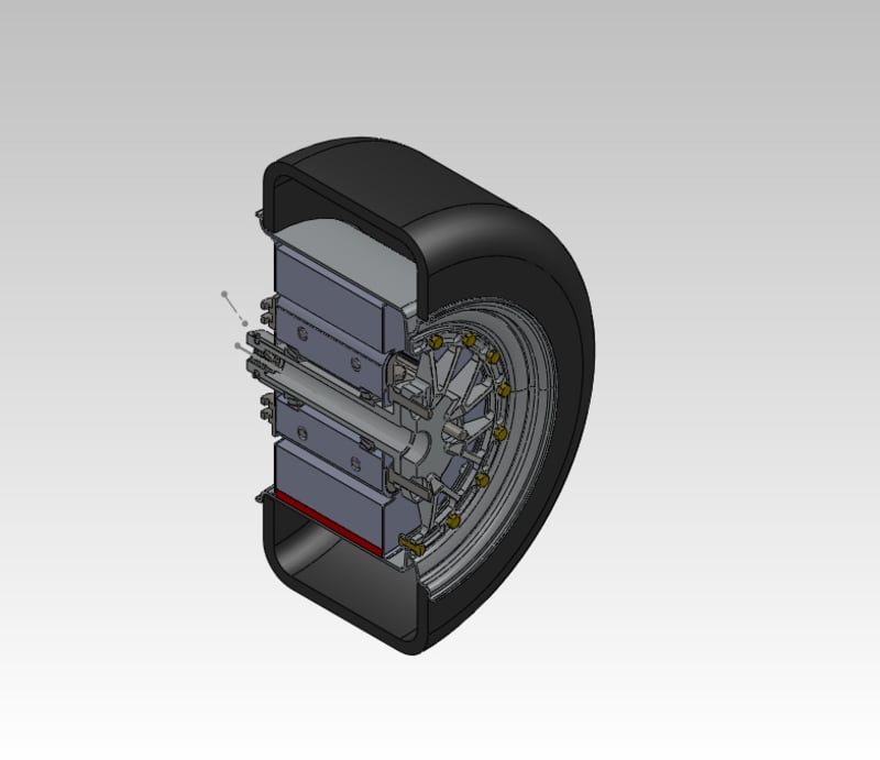 The stator is located at the center of the wheel. Its magnetic circuit is compromised of copper wire windings around poles. The windings are fed with electric current to produce a magnetic field. The stator also serves as the mechanical link between the wheel and the chassis of the vehicle. Also a hub is housed within the stator to hold the wheel and rotor in place by means of bearings.