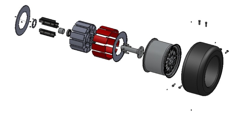 A major advantage is that the entire Magneto-Motive Force (MMF) developed is utilized to drive the wheel i.e. higher efficiency overall; this was practically realized by using the rim itself as the rotor. The rim was modified to include magnetic elements and metal inserts to maximize the developed torque. Furthermore, placing the motor inside the wheels saves immense space inside an electrically driven vehicle, giving room for batteries while decreasing the required construction which simplifies the design of the whole vehicle and ultimately decrease weight allowing the vehicle to go further on a charge. This design also eliminates bulky and heavy mechanical elements (such as, differentials; drive shafts and etc.)