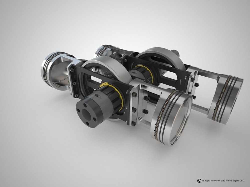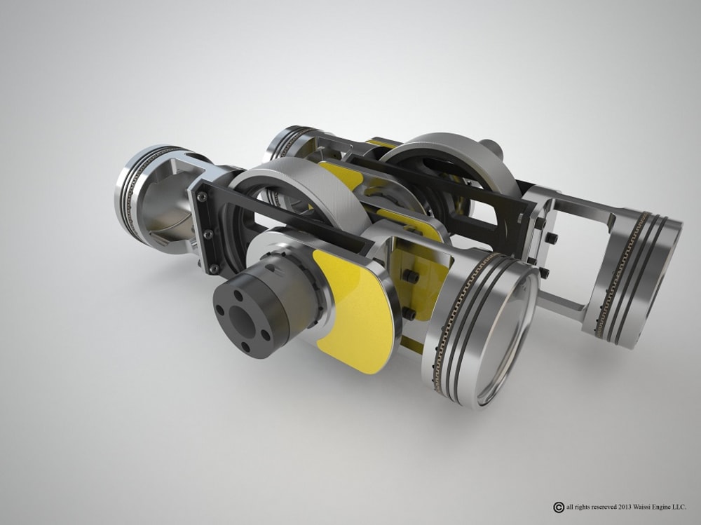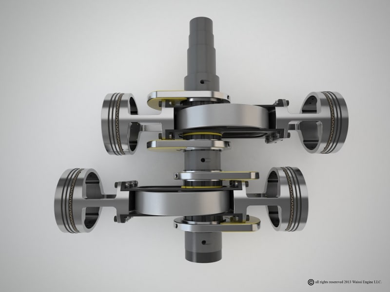 * The WAISSI ENGINE has the simplest possible opposed cylinder, opposed piston design. The design employs an integrated piston, driveshaft, crankdisk, and a bearing ring for each cylinder pair. There is not traditional crankshaft and no connecting rods.