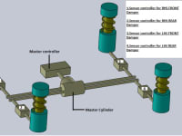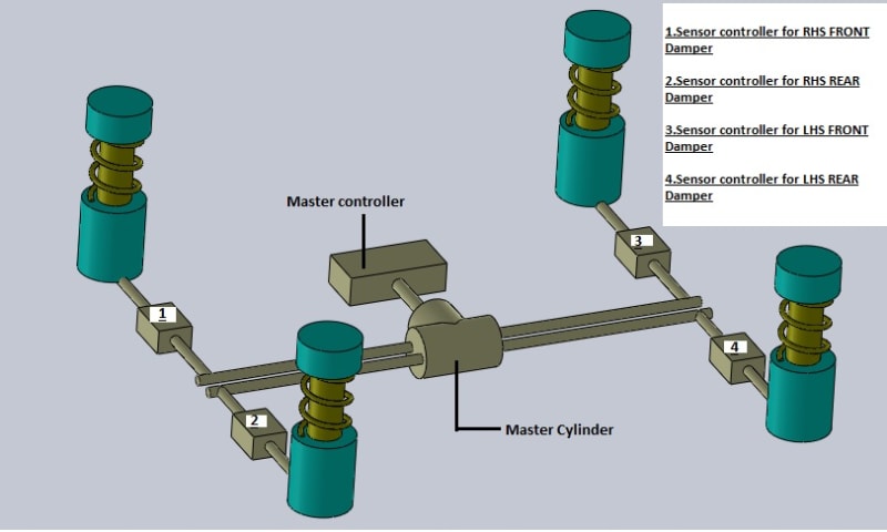 This problem of toppling occurs due to the shift of center of gravity from its mean position. The main motive of the given design is to eliminate this problem of shifting of center of gravity at the time of curves. To do so, dampers of the car has been joined to each other to form a closed hydraulic system. In this system we have master cylinder, placed in the center which controls the pressure in the dampers. Master cylinder is joined to dampers through sensor controller. The model of the system is shown.
