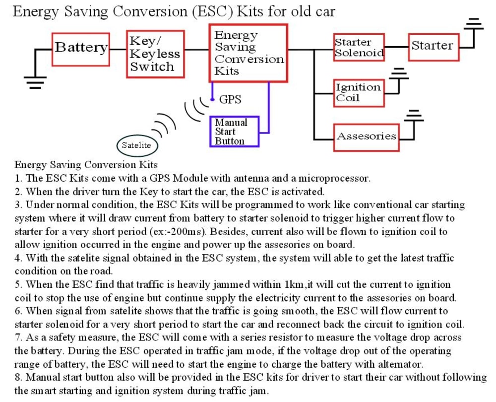Energy Saving Conversion (ESC) Kits is designed to be fitted in various kinds of old cars to interrupt smartly the starting and ignition system for better energy consumption during urban drive. The conversion kit will be installed easily on board by cutting the existing wire from the ignition switch and joint it to the ESC Kits accordingly. Only with this approach where less modification required and low manufacturing cost for the ESC Kits, energy saving for old cars able to be achieved.